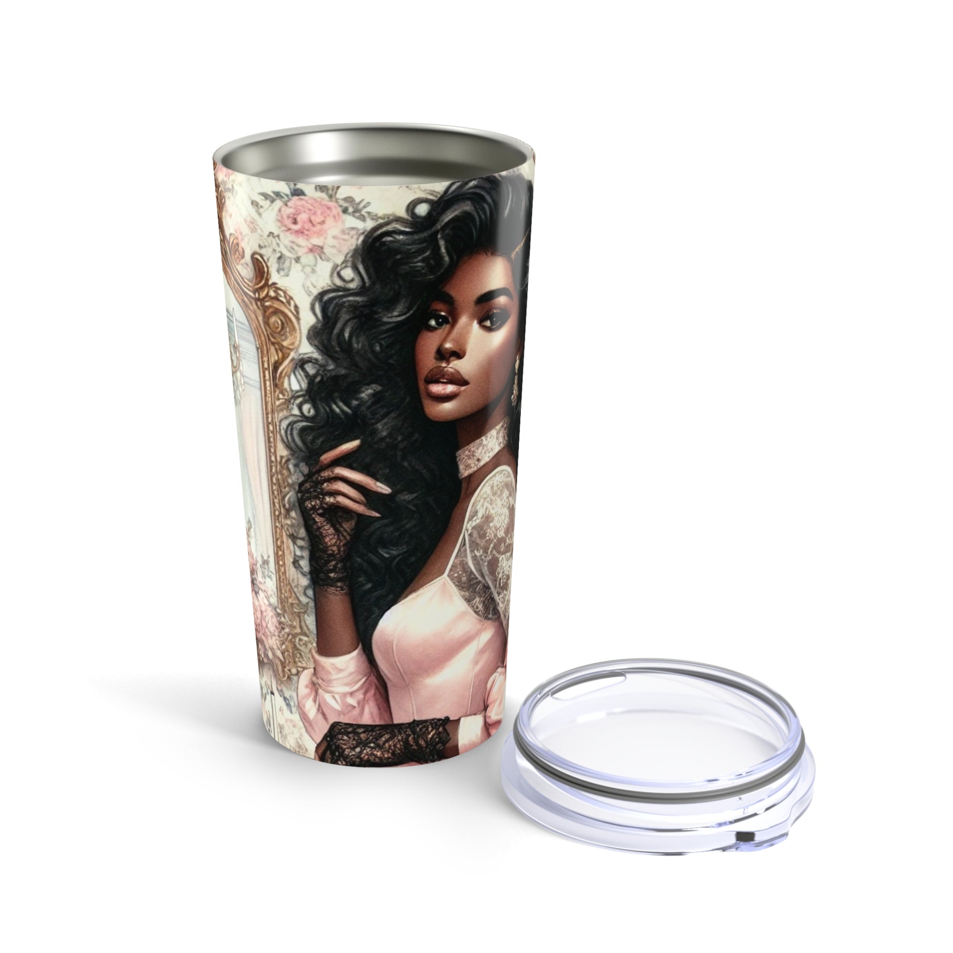 This stylish tumbler features a fashionable woman ready for tea in an English style powder room, wearing a lovely pastel pink dress with black lace gloves. Perfect for those looking to add a touch of elegance to their daily tea or coffee routine. Ideal for tea lovers, fashion enthusiasts, and those who appreciate vintage-inspired designs. Perfect for Mother's Day, birthdays, or any special occasion.